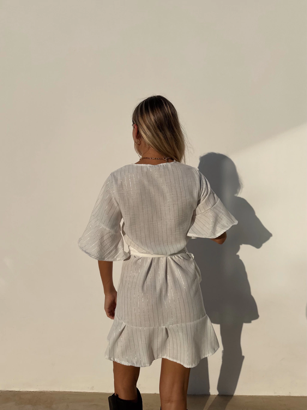 Vestido portafolio con volados en ruedo y en mangas, con lazos para atar y ajustar.