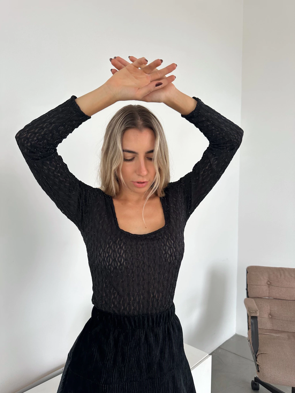 Body escote cuadrado, mangas largas, con broches en entre piernas.