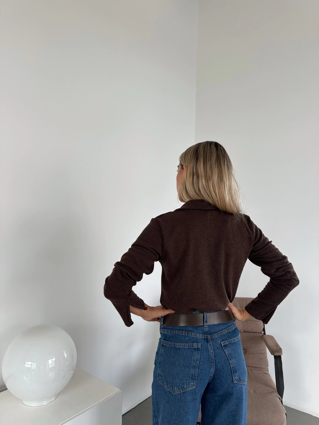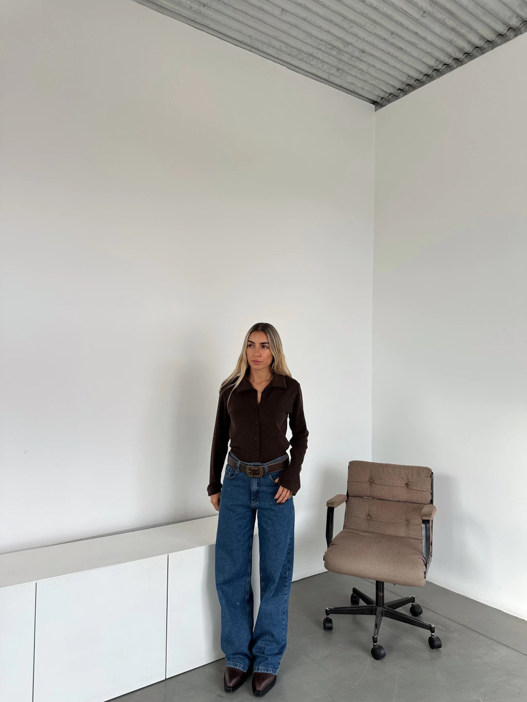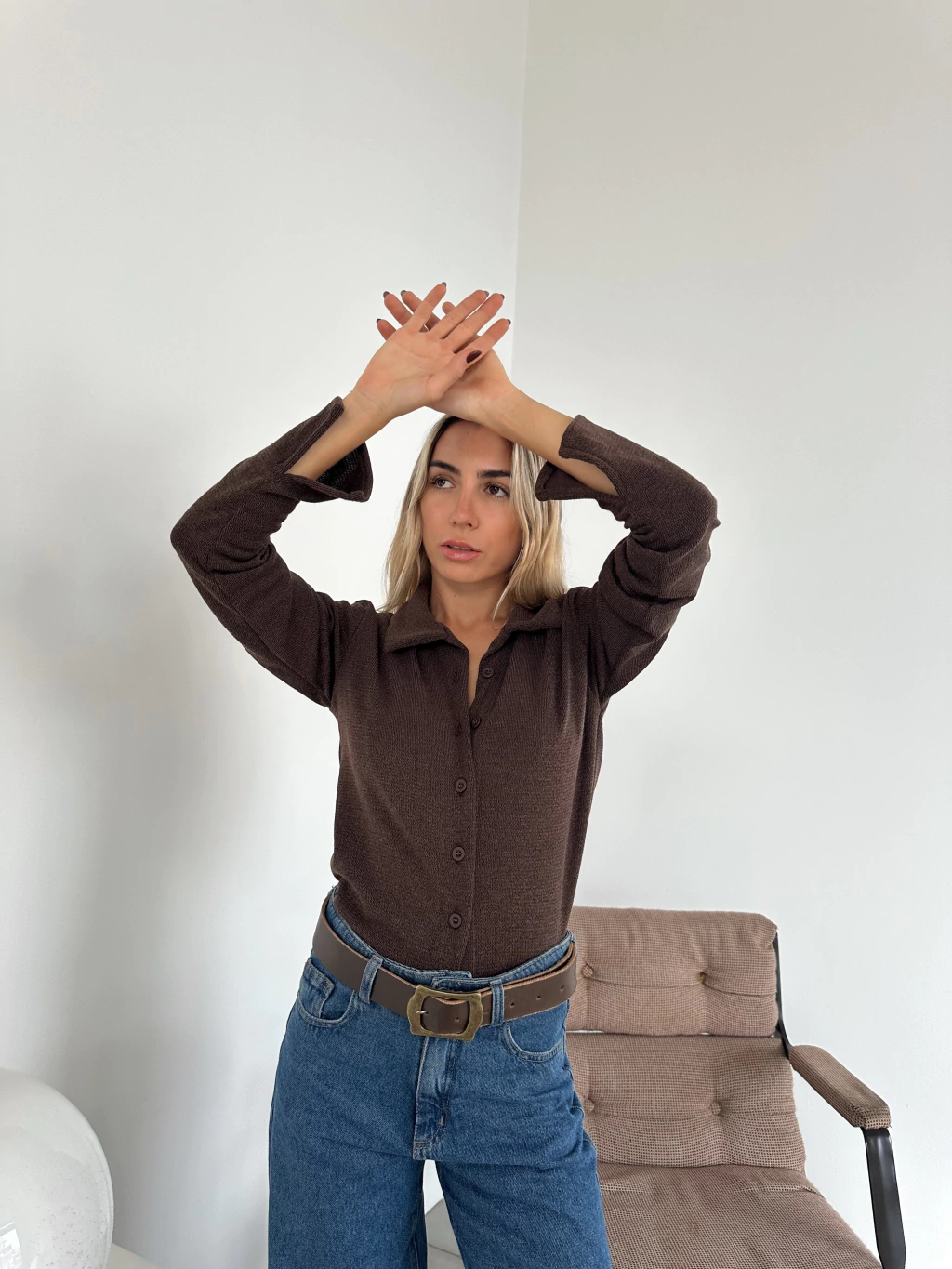 Cárdigan al cuerpo, con cuello chomba, con botones al frente, manga larga con tajo en puño.