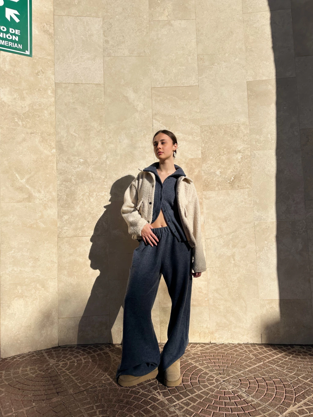Conjunto de camisa y pantalón. Camisa corte regular, con ojal y botón al frente y tajos en puños. Pantalón palazo Oxford con elástico en cintura.