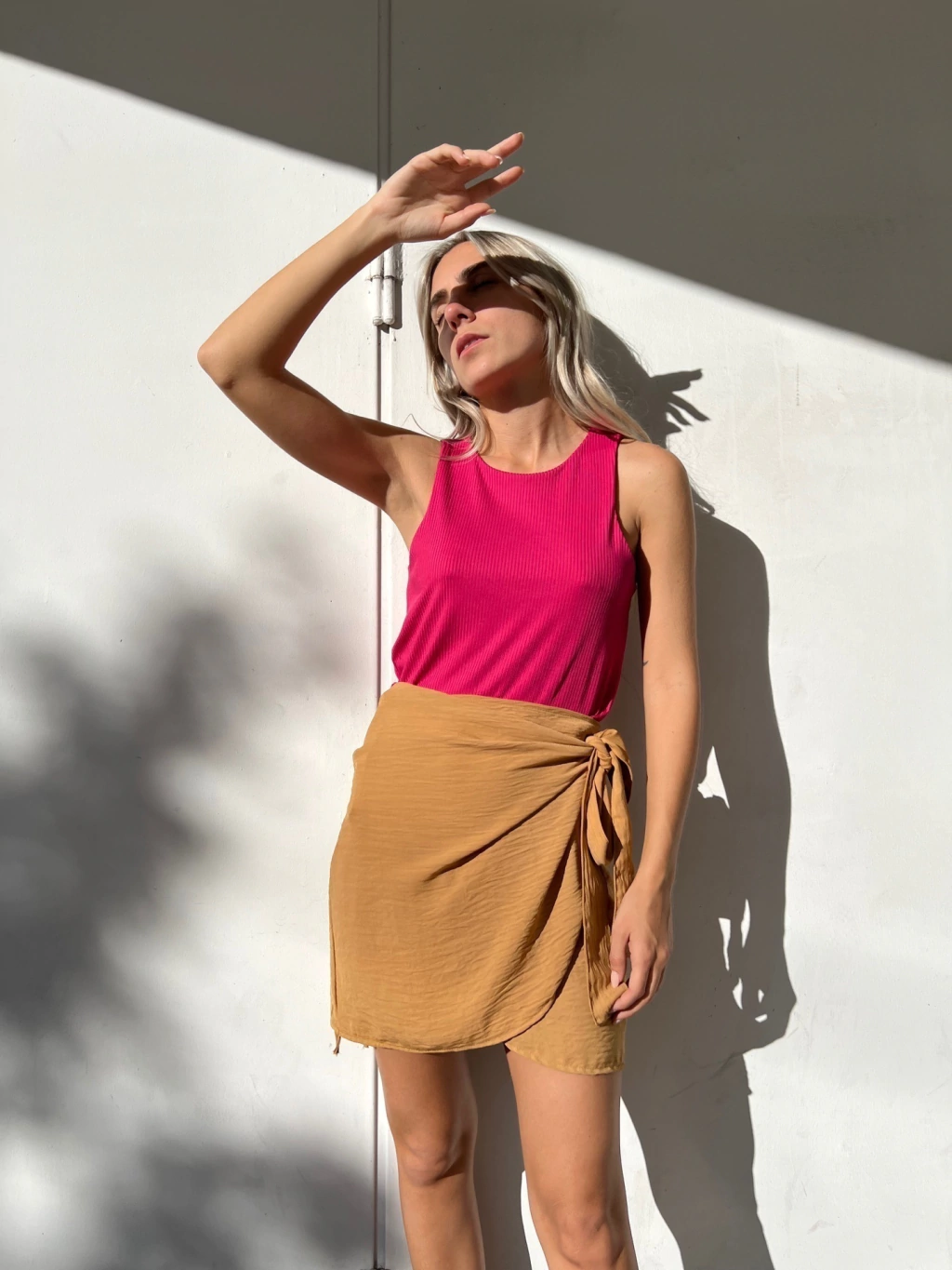 Falda: T1: Contorno de cintura 64 cm (posibilidad de regularla a 72 cm), contorno de cadera 90 cm, largo de la prenda 45 cm.