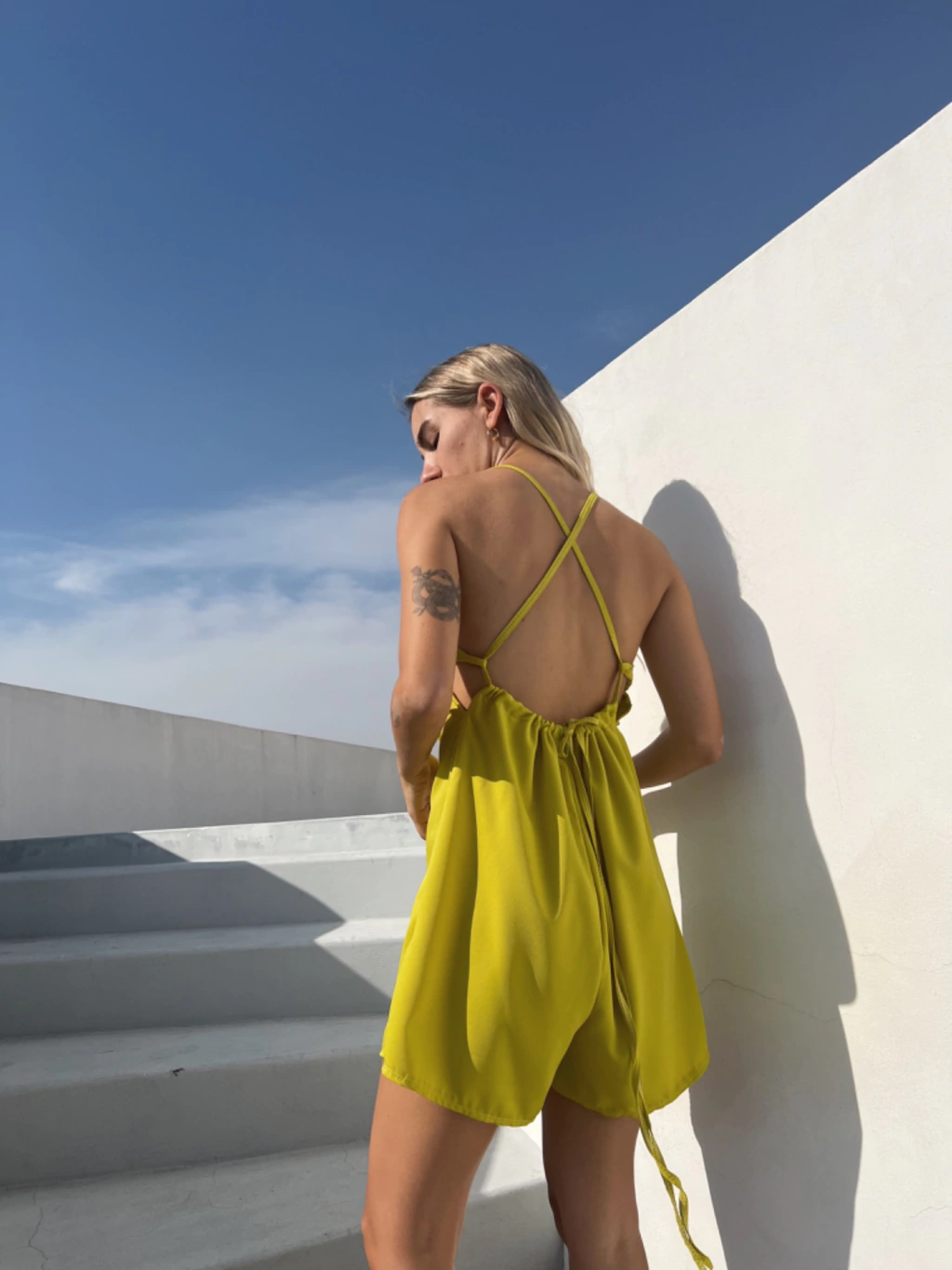 MONO CORTO ESCOTE HALTER CON ESPALDA DESCUBIERTA Y BRETELES FINOS PARA REGULAR, AJUSTAR Y ATAR.