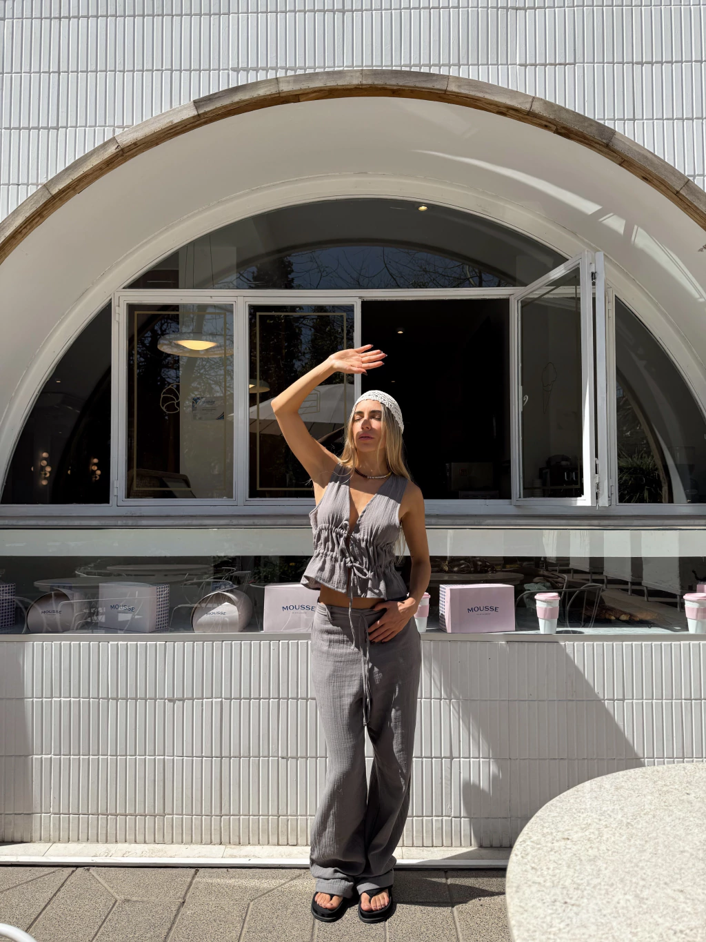 Es un top muscolosa, con lazos en bajo busto y cintura para ajustar y fruncir.