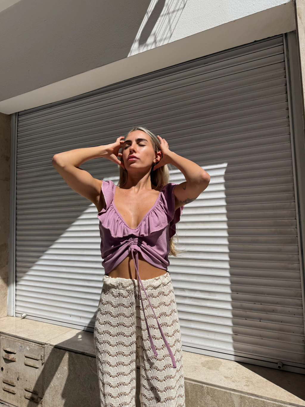 Top con volados en los breteles y escote con lazos delanteros para fruncir y acortar.