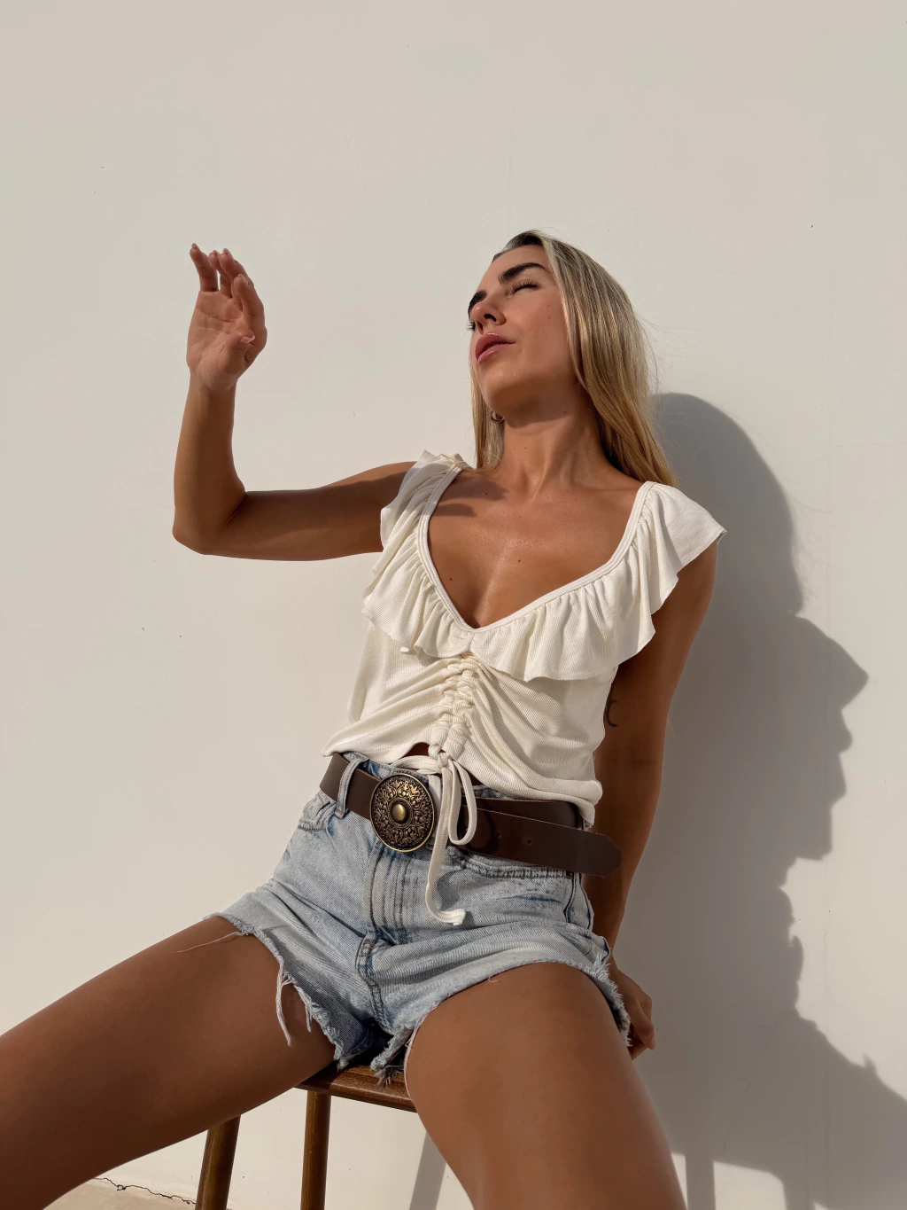 Top con volados en los breteles y escote con lazos delanteros para fruncir y acortar.