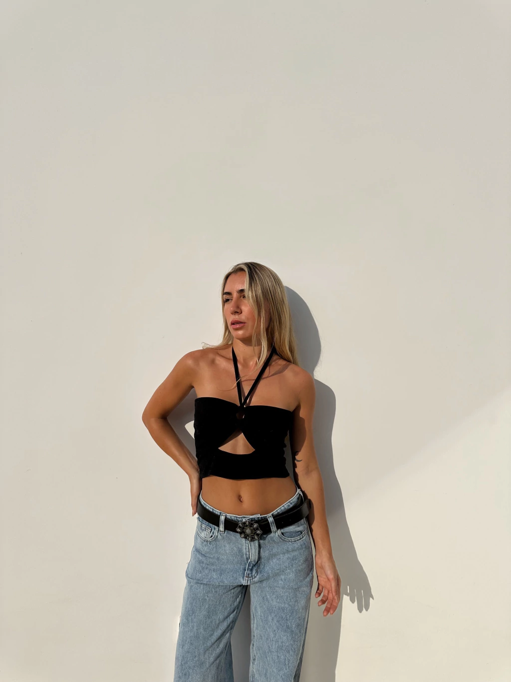 Top cut out con argolla metalica y breteles para atar al cuello.